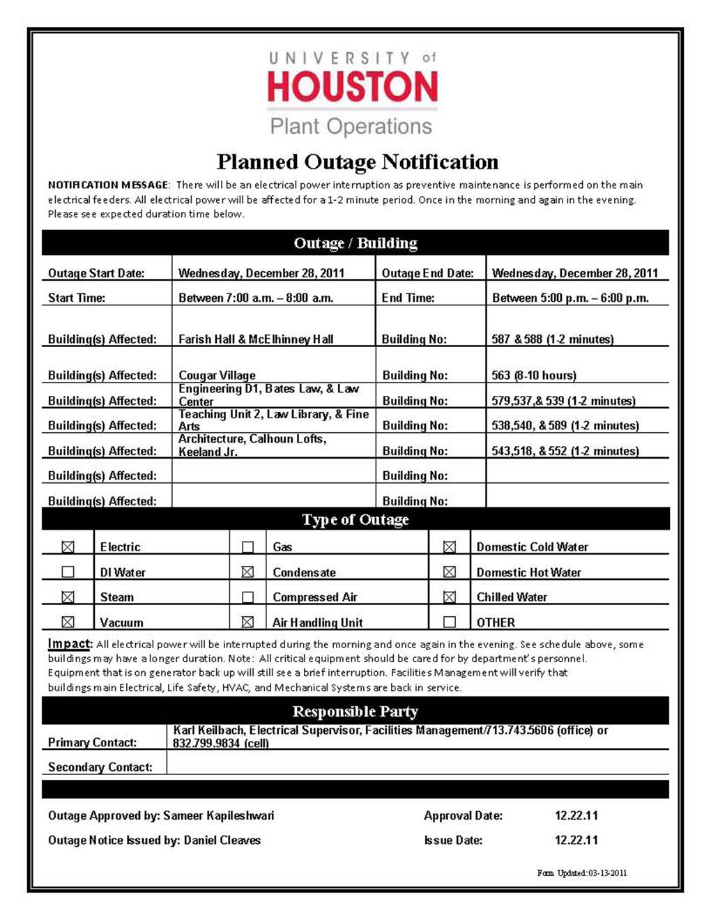 [CCoE Notice] FW: PLANNED ELECTRICAL OUTAGE- (Engineering 1)- 12.28.11-12.28.11