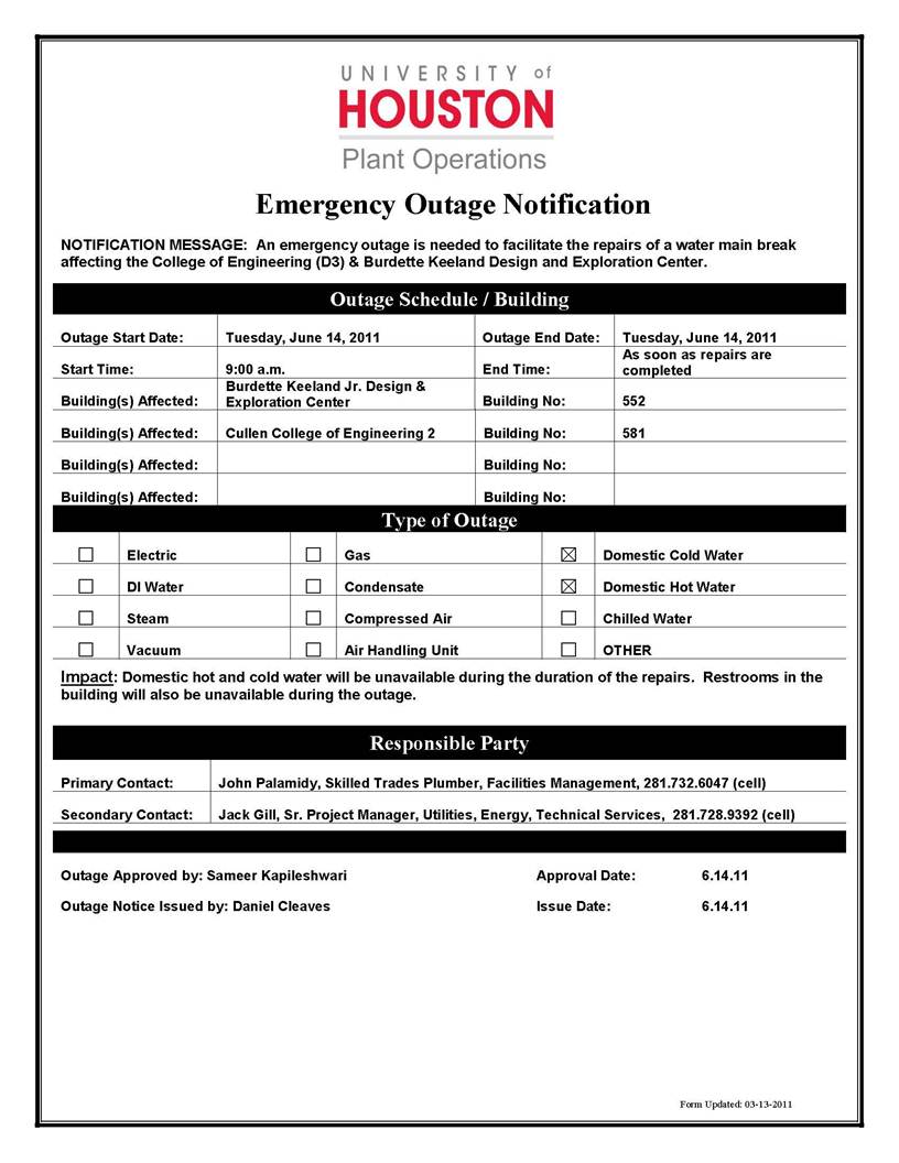 [CCoE Notice] DOMESTIC HOT & COLD WATER EMERGENCY OUTAGE- BKD (#552) & D3 (#581)