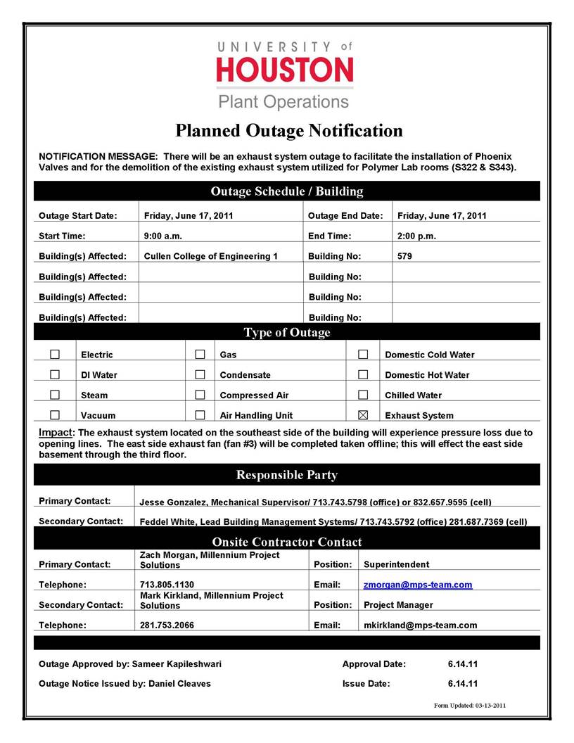 [CCoE Notice] EXHAUST SYSTEM OUTAGE- D3 (#579)- 6.17.11 THRU 6.17.11