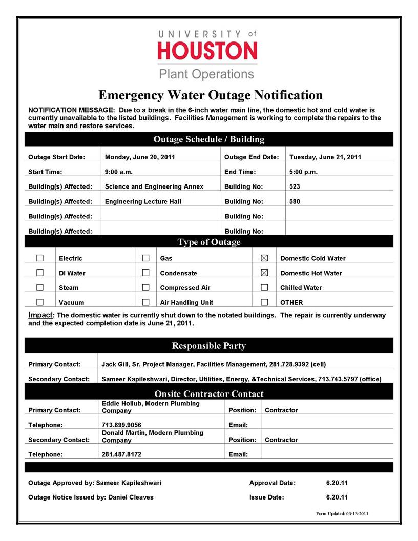 [CCoE Notice] EMERGENCY WATER OUTAGE NOTIFICATION- SCIENCE AND ENGINEERING ANNEX (#523) & ENGINEERING LECTURE HALL (#580)- 6.20.11 THRU 6.21.11