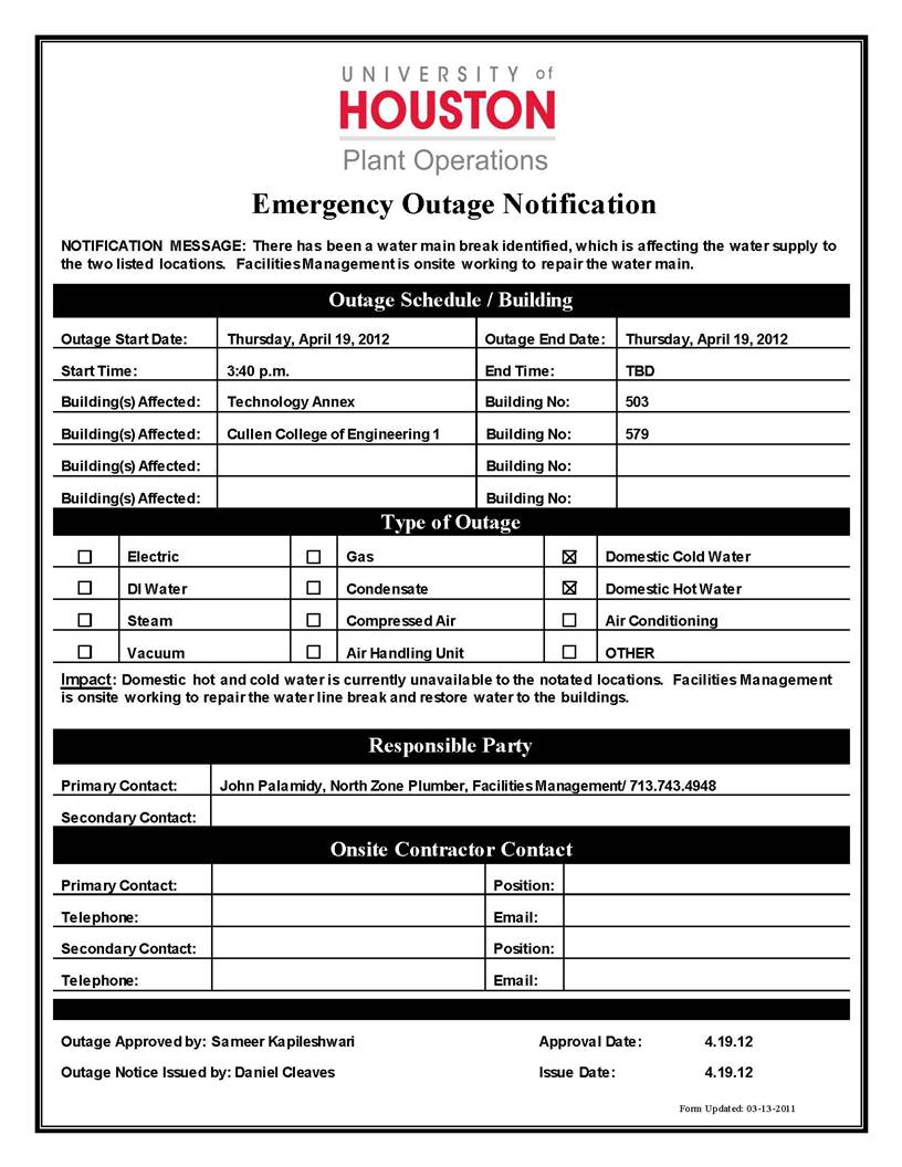 [CCoE Notice] EMERGENCY WATER OUTAGE NOTIFICATION - BUILDINGS #503 & #579 - 4.19.12