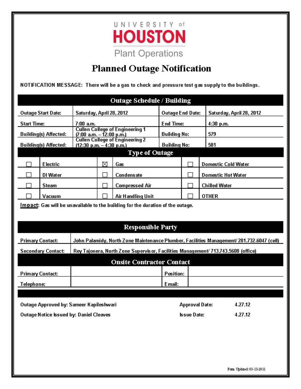 [CCoE Notice] GAS OUTAGE NOTIFICATION- BUILDINGS (#579, 581)- 4.28.12-4.28.12