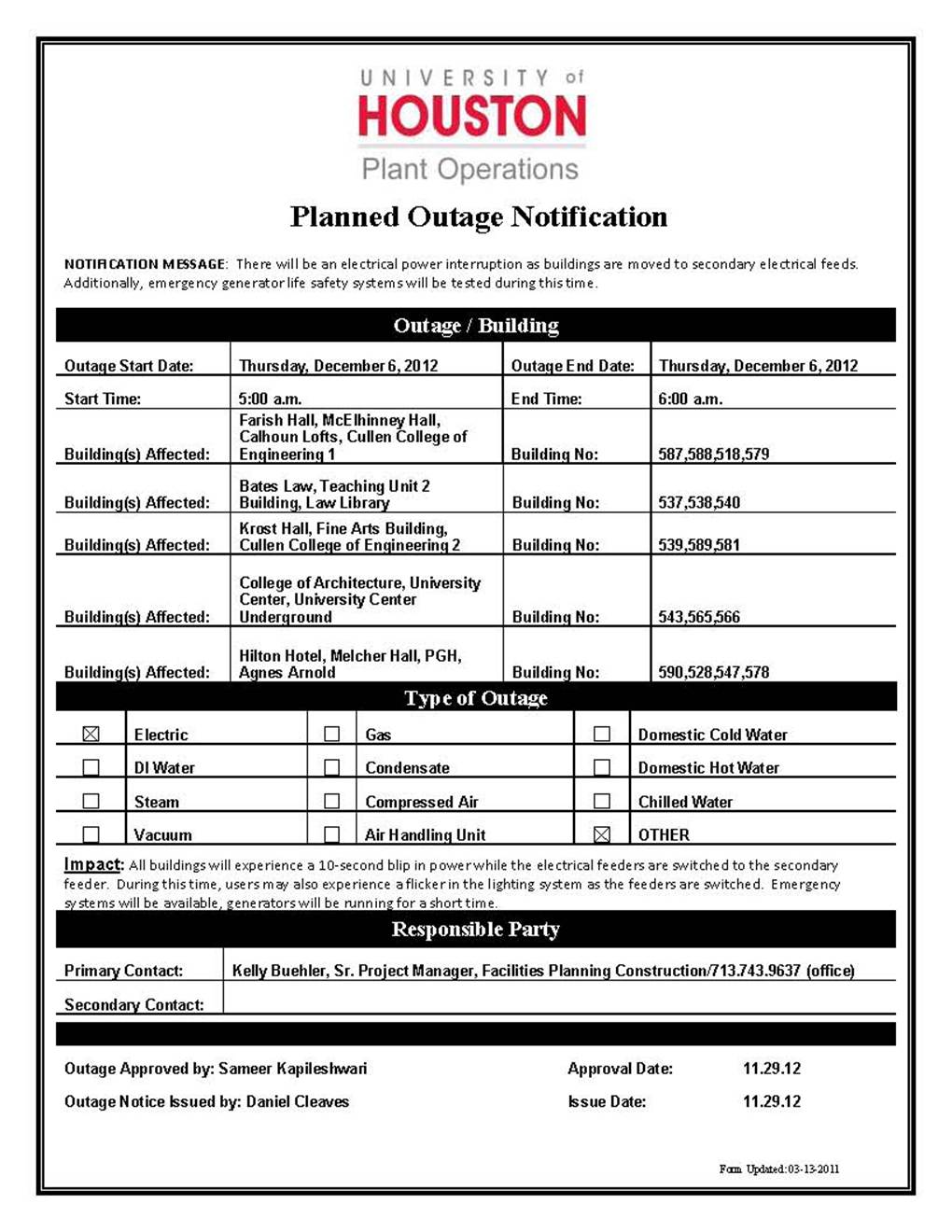 From: Notice to campus for planned [mailto:OUTAGENOTIFICATIONS at LISTSERV.UH.EDU] On Behalf Of Cleaves, Daniel