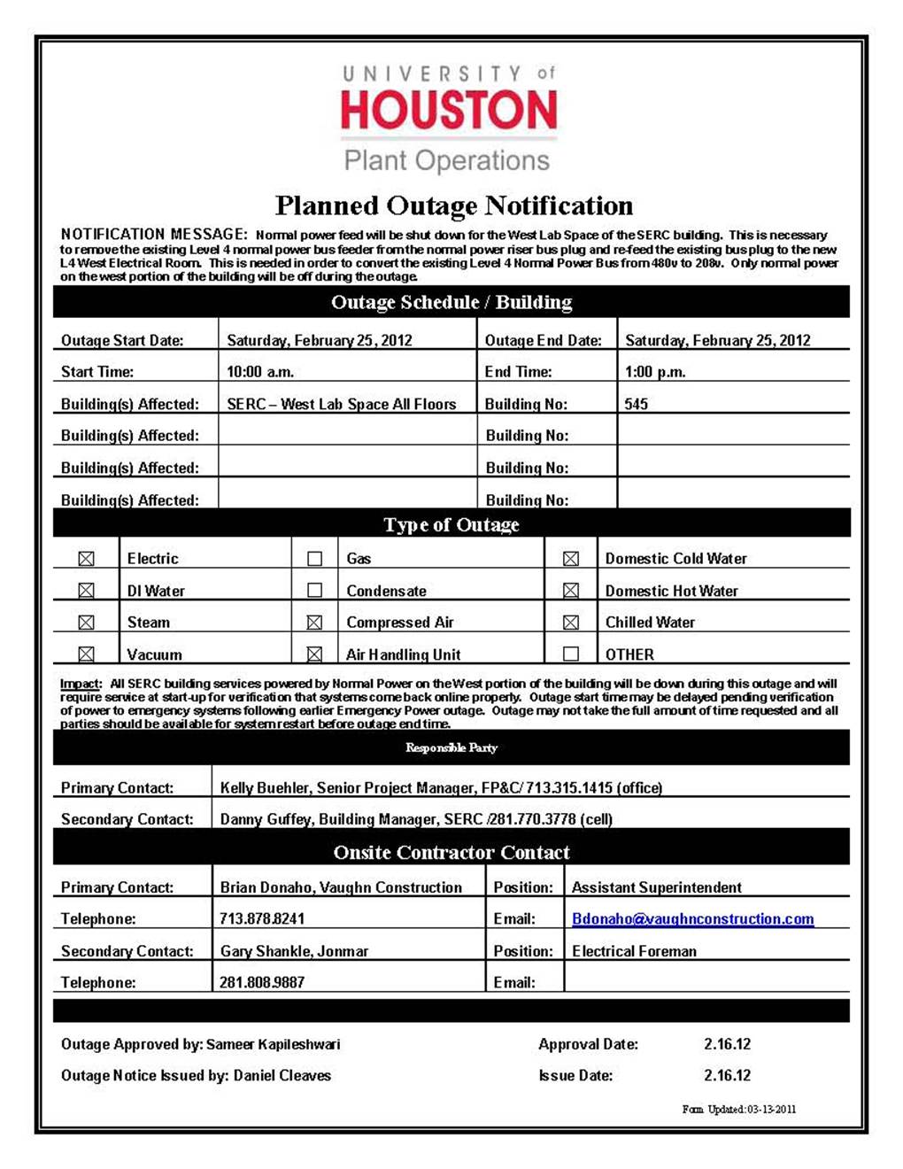 [CCoE Notice] NORMAL POWER OUTAGE NOTIFICATION- SERC (#545)- 2.25.12-2.25.12