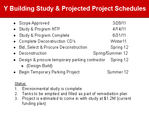 Plans for the Y Building demolition are moving forward. The RFP will be going out in March and the contractor will be selected in April. See the general schedule below for the project scope. Details for the project schedule will be defined once the contractor is selected.