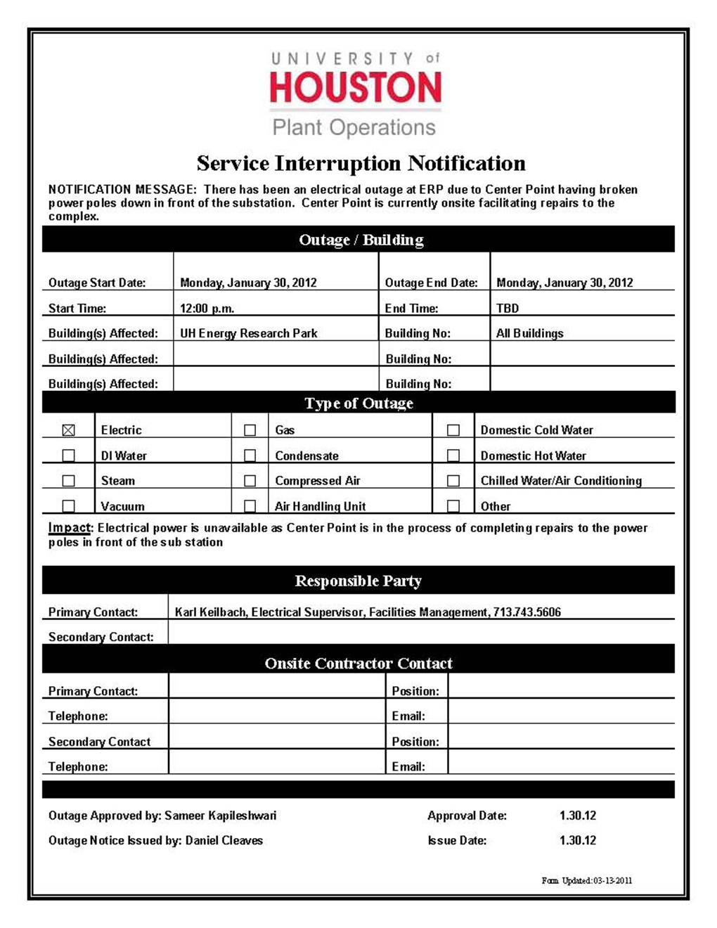 [CCoE Notice] SERVICE INTERRUPTION NOTICE- ENERGY RESEARCH PARK (ALL BUILDINGS) 1.30.12-1.30.12