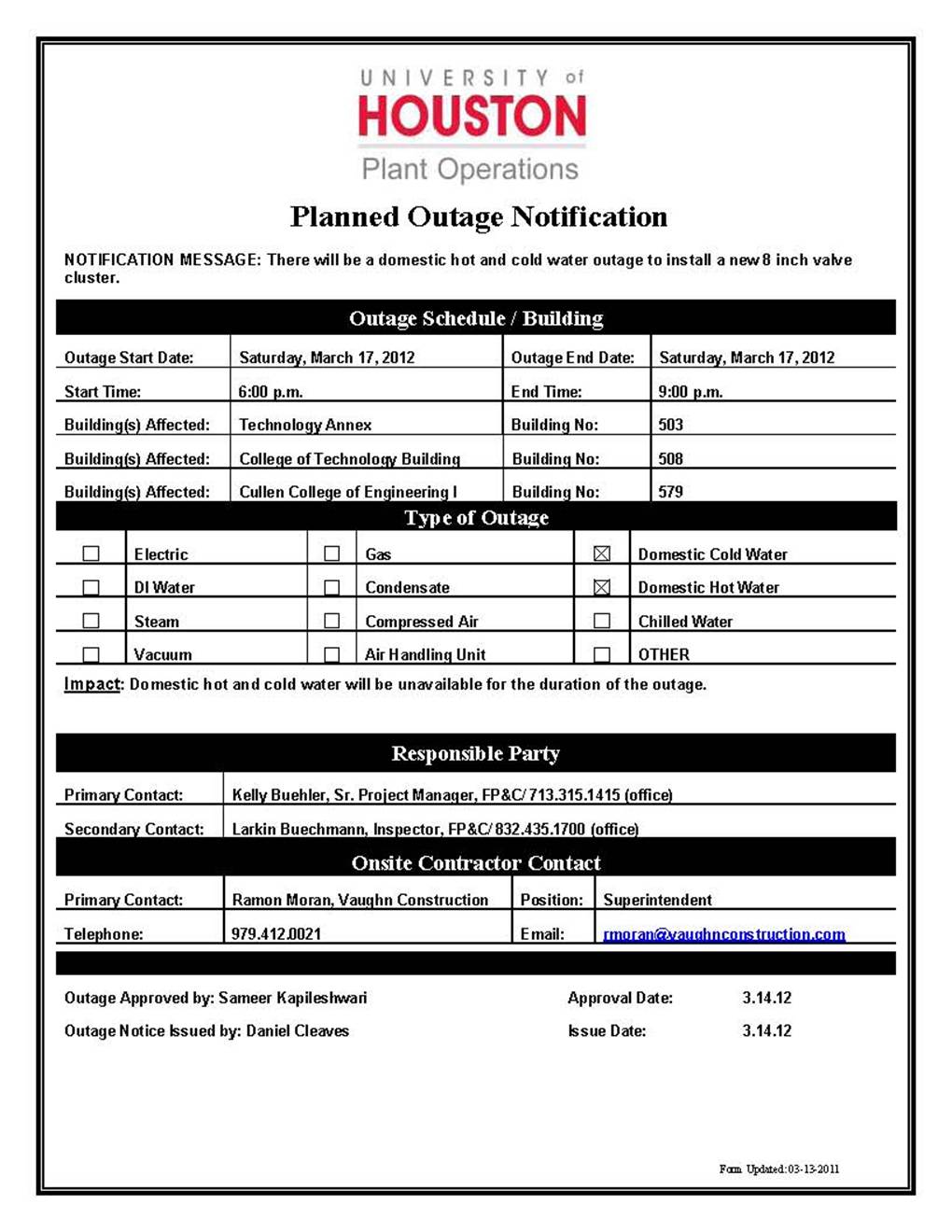 Subject: DOMESTIC HOT AND COLD WATER OUTAGE- TECHNOLOGY ANNEX, COLLEGE OF TECHNOLOGY, CULLEN COLLEGE OF ENGINEERING- (503,508,579)- 3.17.12-3.17.12