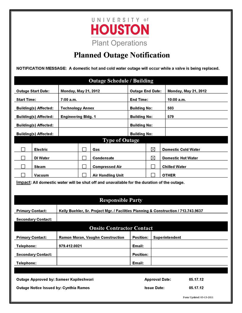 [CCoE Notice] DOMESTIC HOT & COLD WATER OUTAGE NOTIFICATION - BUILDINGS #503 & #579 - 05.21.12