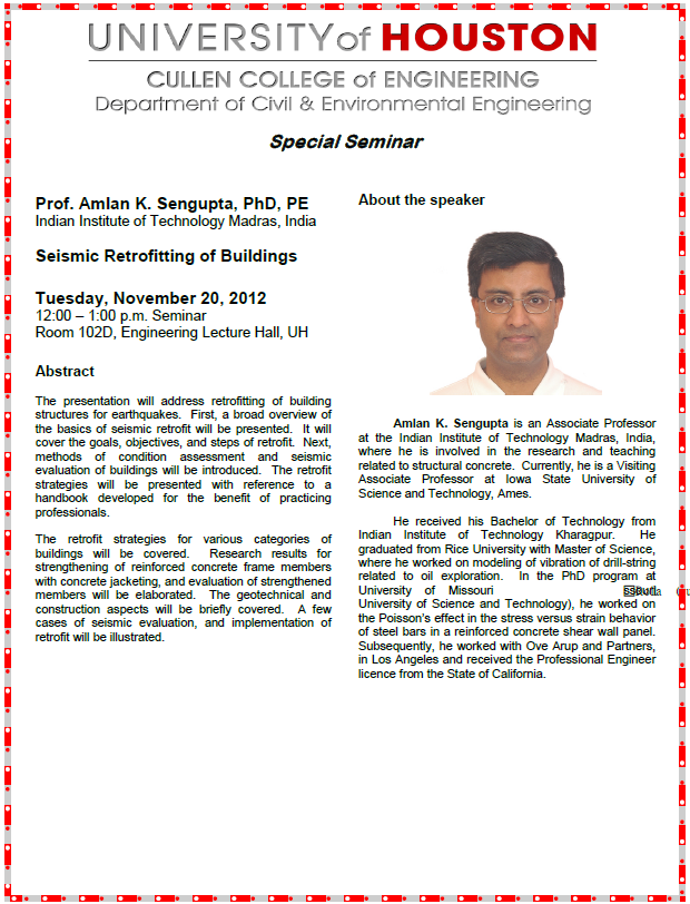 [CCoE Notice] Civil & Environmental Engineering Distinguished Lecture Series - SEISMIC RETROFITTING OF BUILDINGS - Amlan K. Sengupta, PhD PE - Tue, November 20th - 12:00 - 1:00, 102D
