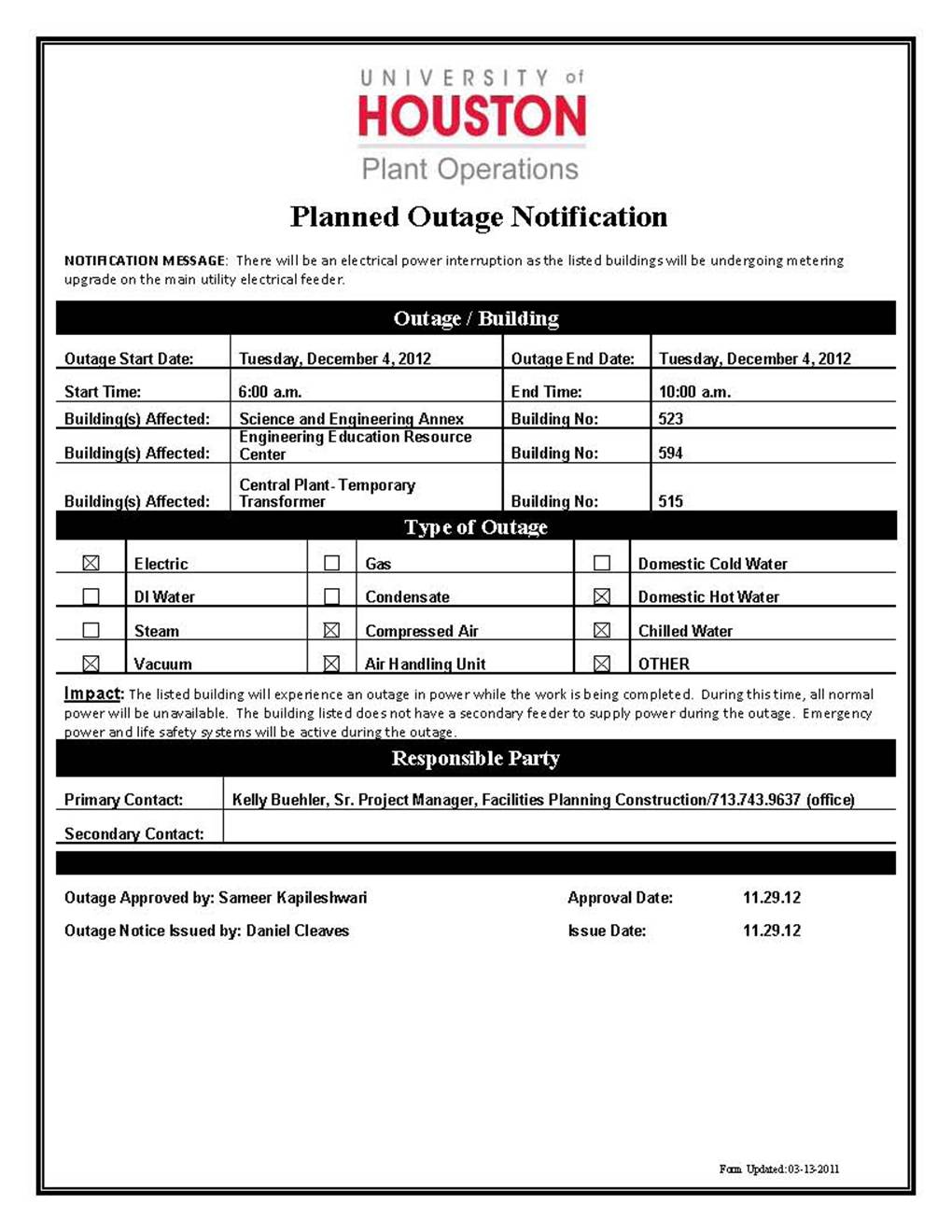 [CCoE Notice] ELECTRICAL OUTAGE NOTIFICATION- VARIOUS LOCATIONS- (523, 594, 515)- 12.4.12-12.4.12