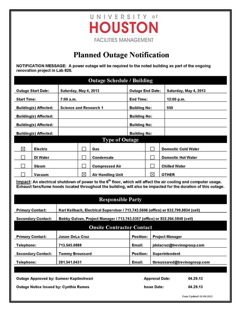 [CCoE Notice] FW: ELECTRICAL OUTAGE NOTIFICATION - SCIENCE & RESEARCH 1 #550 - 05.04.13