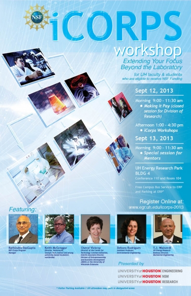 The workshop is free of charge. Click here to register for one or both sessions<http://www.egr.uh.edu/advancement/external_relations/icorps-2013-registration>.