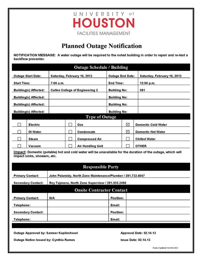 From: Notice to campus for planned [mailto:OUTAGENOTIFICATIONS at LISTSERV.UH.EDU] On Behalf Of Ramos, Cynthia M