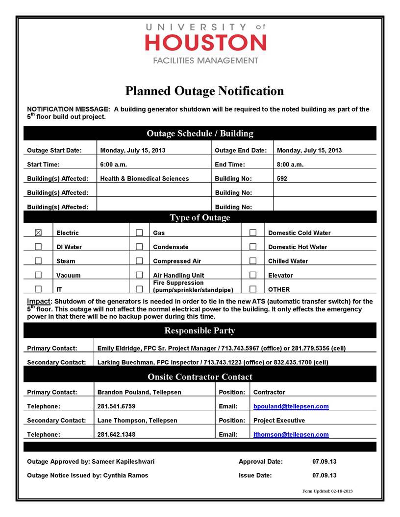 Subject: ELECTRICAL OUTAGE NOTIFICATION - HEALTH & BIOMEDICAL SCIENCE #592 - 07.15.13