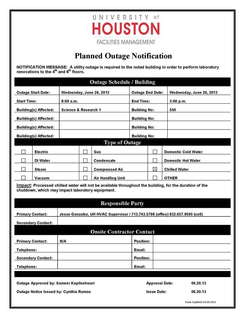 From: Notice to campus for planned [mailto:OUTAGENOTIFICATIONS at LISTSERV.UH.EDU] On Behalf Of Ramos, Cynthia M