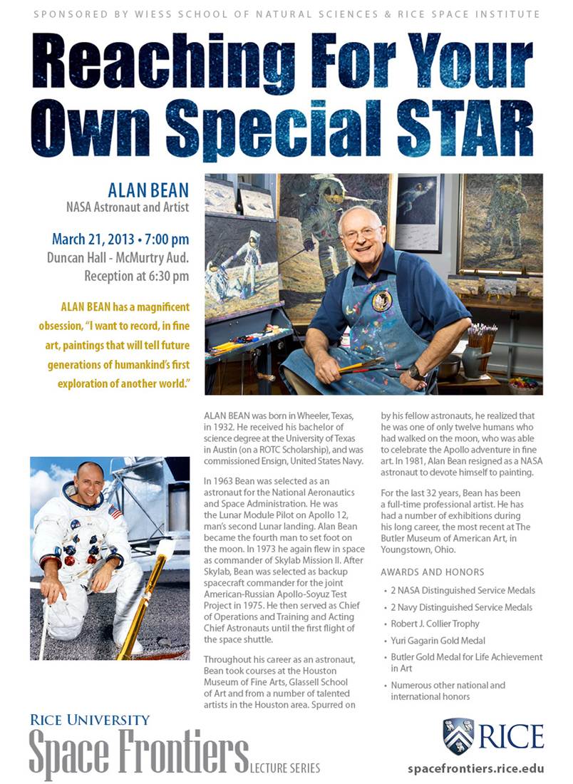 A couple of exciting RSI events coming your way. Please see attached poster for the Alan Bean Space Frontiers Lecture on March 21, 2013. Feel free to invite colleagues and friends. Space is limited but no RSVPs required.
