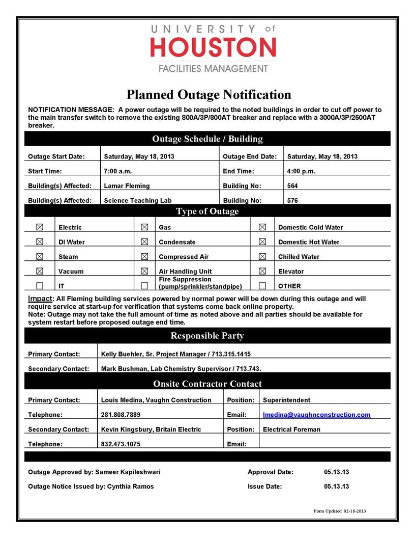 Subject: UTILITY OUTAGE NOTIFICTAION - FLEMING #564 & STL #576 - 05.18.13