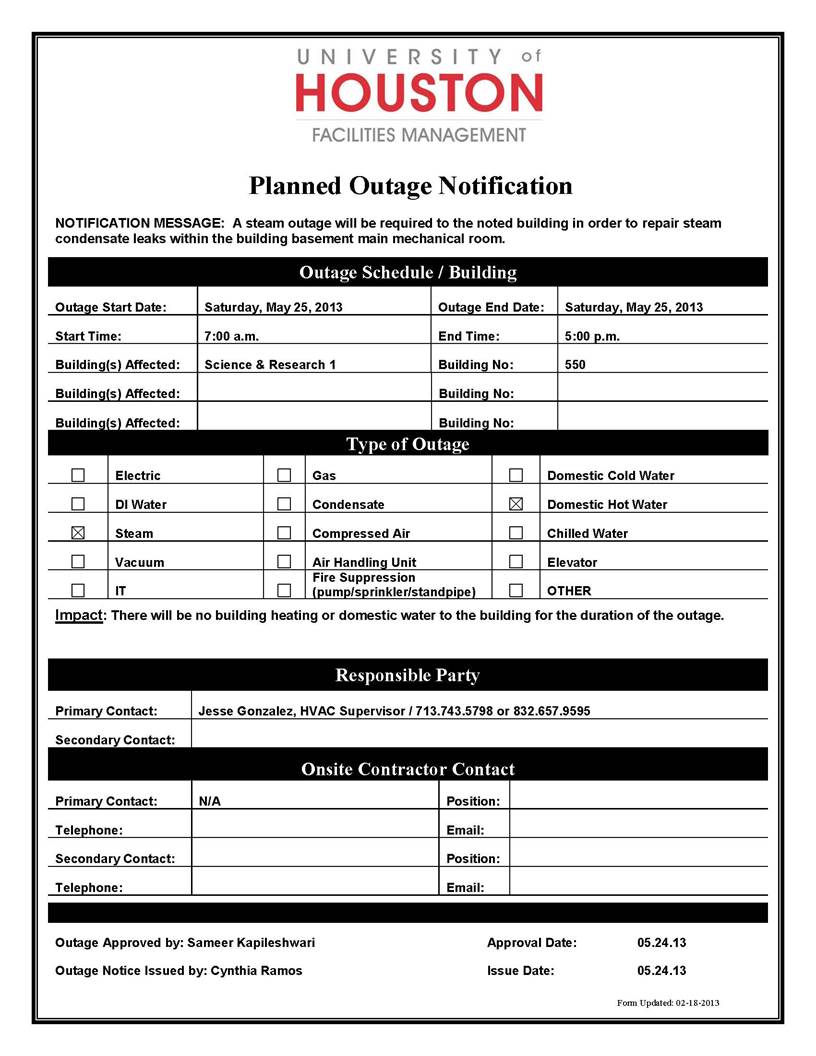 From: Notice to campus for planned [mailto:OUTAGENOTIFICATIONS at LISTSERV.UH.EDU] On Behalf Of Ramos, Cynthia M