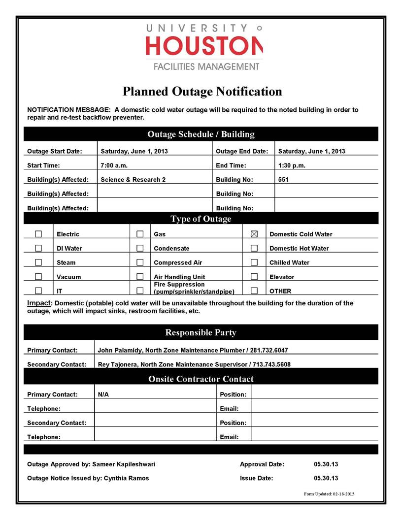 Subject: DOMESTIC COLD WATER OUTAGE NOTIFICATION - SR2 (#551) - 06.01.13