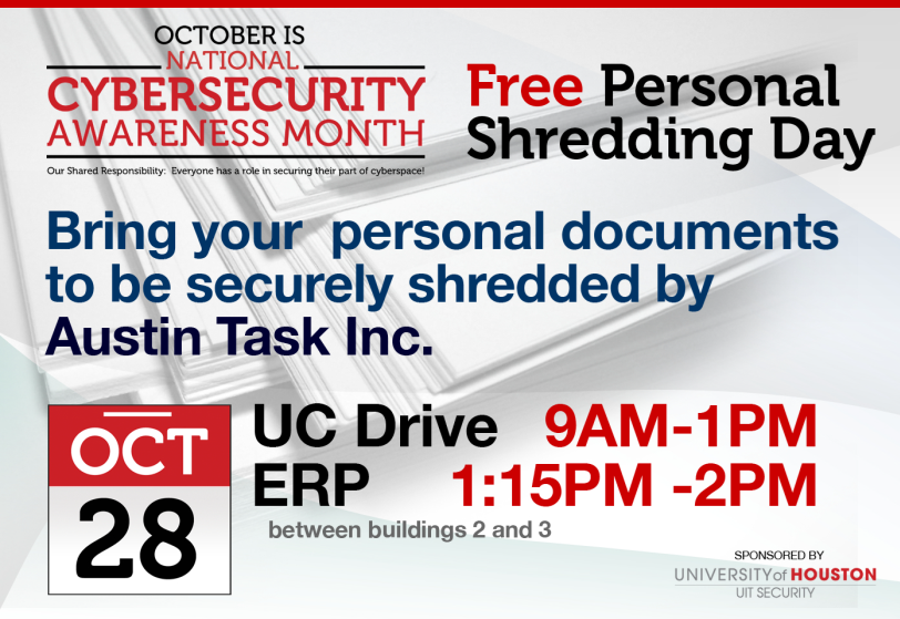 UIT Security is hosting a Free Personal Shredding Day for faculty, staff and students on Monday, October 28th. This event is for personal documents only, not for UH documents. UH documents should be placed in shred bins located in UH departments. Below is the flyer and has detailed information for this event.
