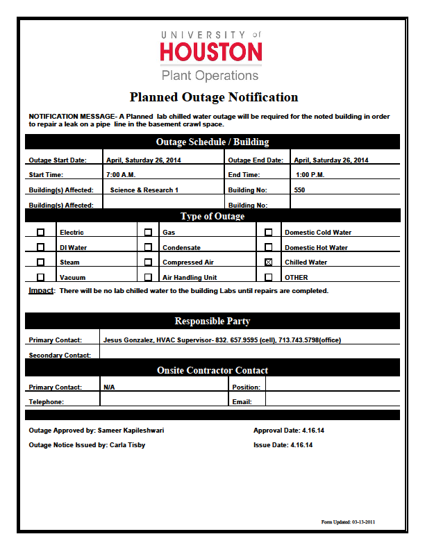 Subject: PLANNED CHILL WATER OUTAGE NOTIFICATION~ SR1 #550 (Saturday 4.26.14)