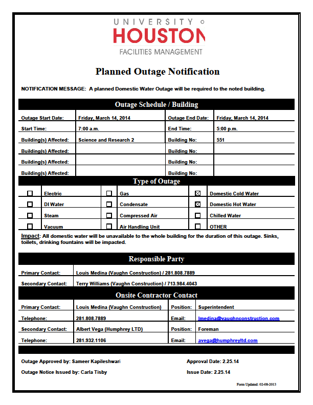 Subject: PLANNED DOMESTIC WATER OUTAGE NOTIFICATION~ SR2 #551 ( Friday 3-14-2014)