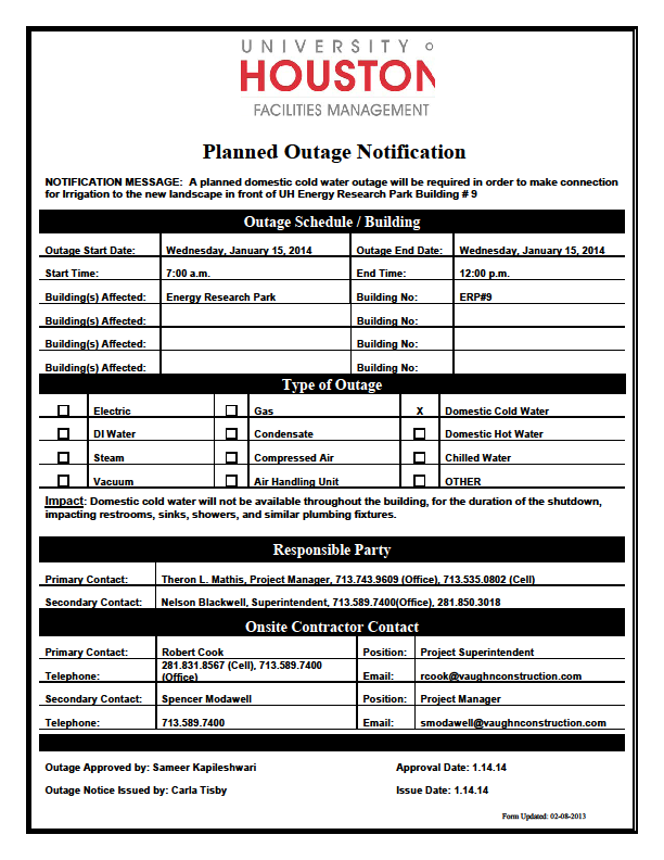 Subject: PLANNED DOMESTIC COLD WATER OUTAGE NOTIFICATION~ ERP #9 ( 1-15-2013 Wed.)
