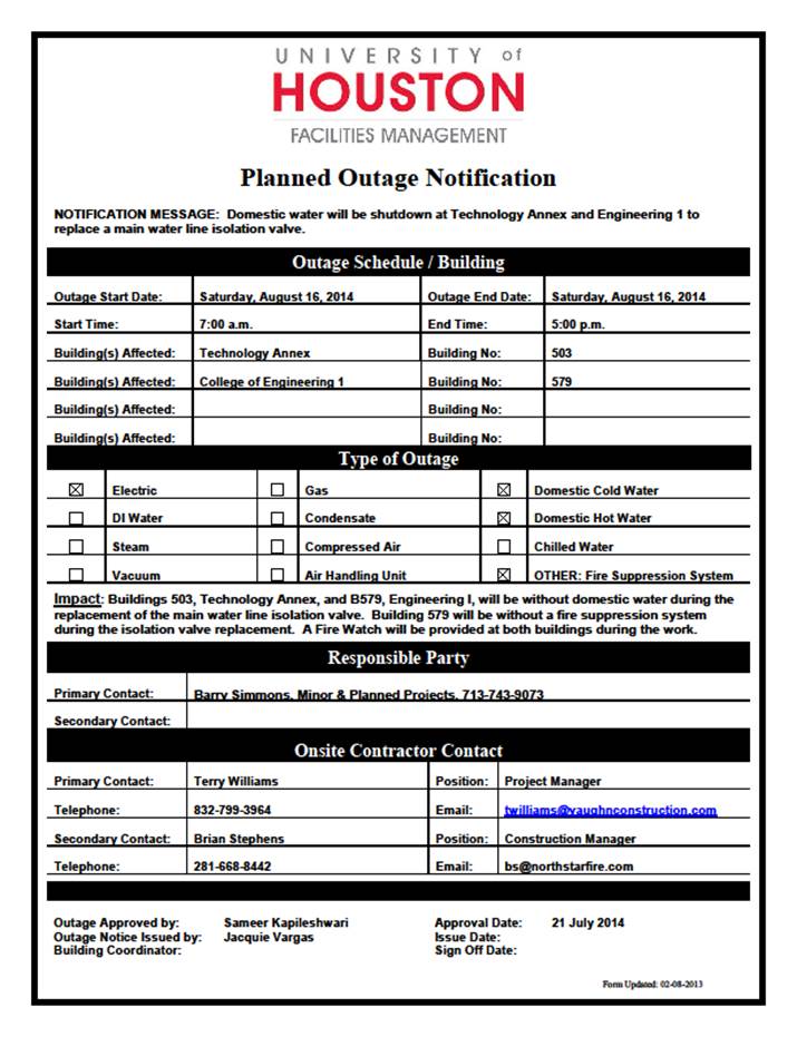 Please note the proposed outage for Saturday, August 16. Domestic water and fire suppression systems will be affected. This is to repair valves controlling the water and fire suppression systems in the Technology Annex and Engineering 1.