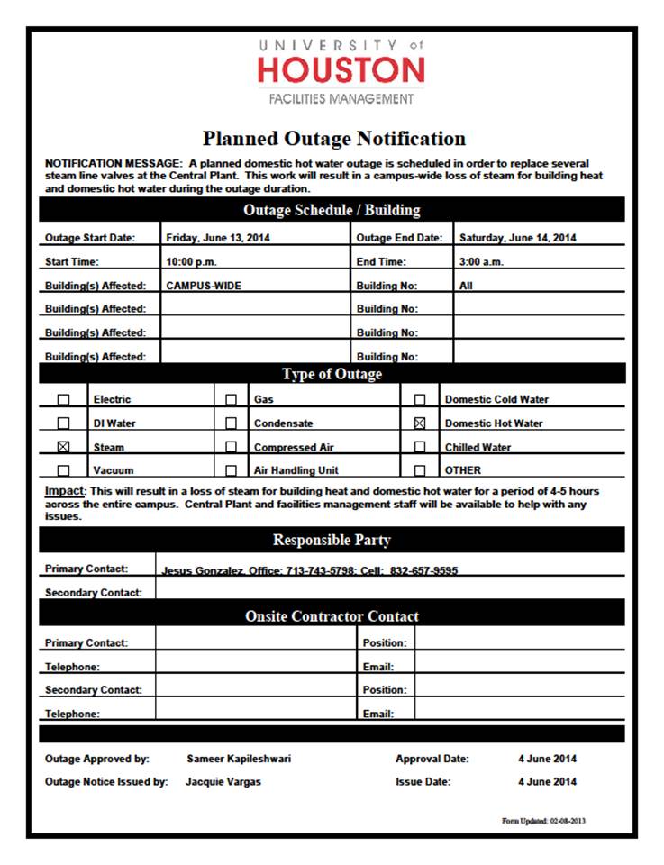 Subject: PLANNED DOMESTIC HOT WATER OUTAGE NOTIFICATION, CAMPUS-WIDE, (10pm, 6/13/14 to 3am, 6/14/14)