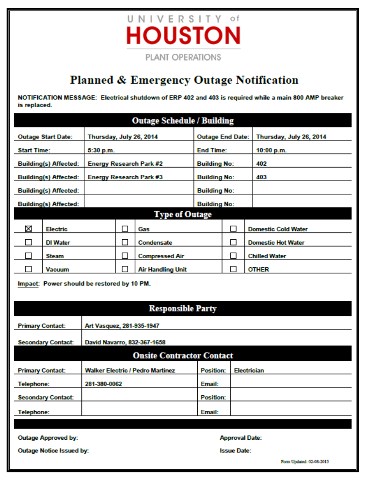 This outage information was shared by the ERP building coordinators Thursday afternoon and we are sharing through our Plant Ops standard outage notification protocol in the event your department or unit may maintain office space and/or personnel in one of the buildings. If you are already aware of the work being done, please disregard this message.