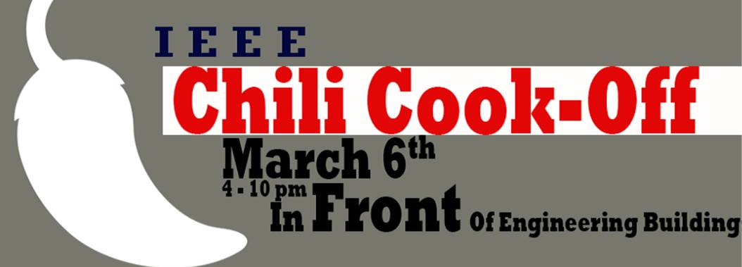 Don't miss this year's biggest event: the IEEE 35th Annual Chili Cook Off! The event will kick off @ 4pm this Thursday. There will be plenty of free food, drinks, and activities. We will be having a great turnout from student organizations as well as some great companies. Events include chili competition, hot dog eating competition, robotics competition, car smashing, giant Jenga, live DJ, and many others. Don't forget the free beer for students 21+ with a valid ID. Also, be sure to snatch your own coveted Cook Off shirt for free!