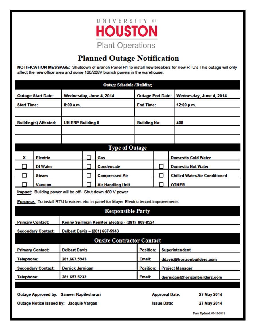 Subject: PLANNED ELECTRICAL OUTAGE NOTIFICATION - ERP #408 (WEDNESDAY 6-4-2014)
