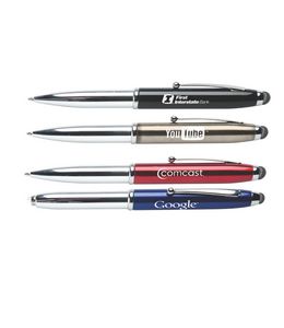 Point, write or shine your way to promotional success! The T. Macy Triple Function, 3-in-1 multi-tasker features a ballpoint pen that quickly changes to a Mesh stylus pull cap with advanced connectivity for all touchscreen devices and a bright and powerful push-to-activate LED flashlight. Offered in attractive colors, the high gloss chrome and enamel barrel comes with a silver engraving of a logo, name or custom design to get your promotional message across.