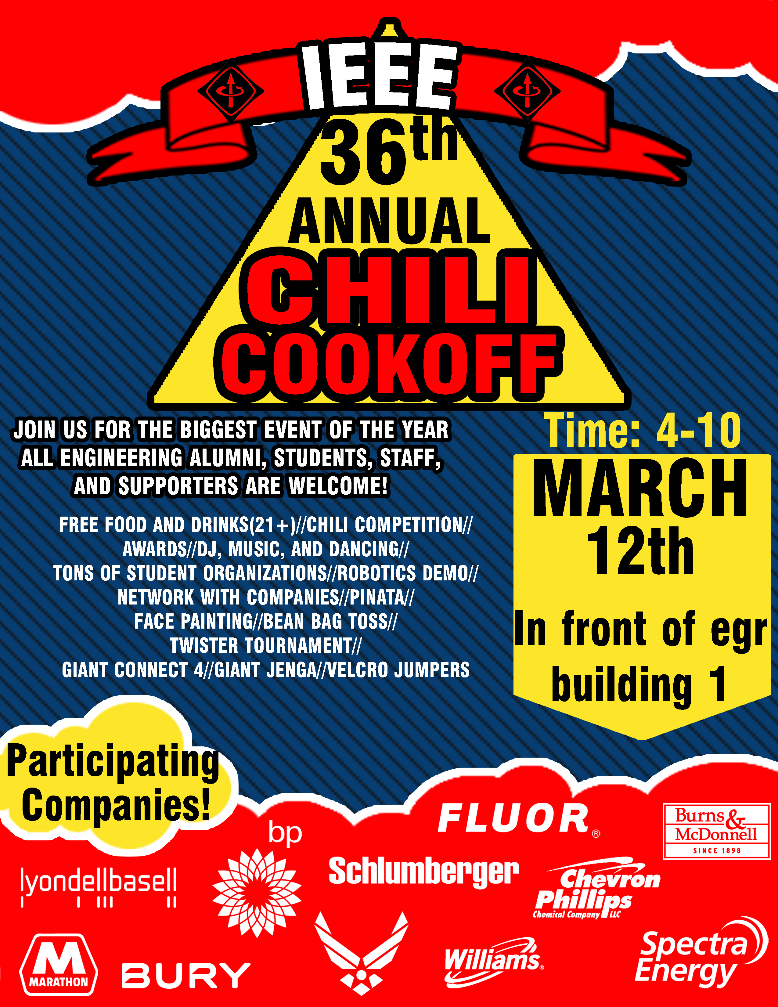 The IEEE chili cook off is next Thursday, March 12, 2015 from 4 pm to 10 pm. Attached you will find a flyer, a map layout, and a schedule for the event. This year we would like to see as many faculty, staff, and alumni involved as possible!