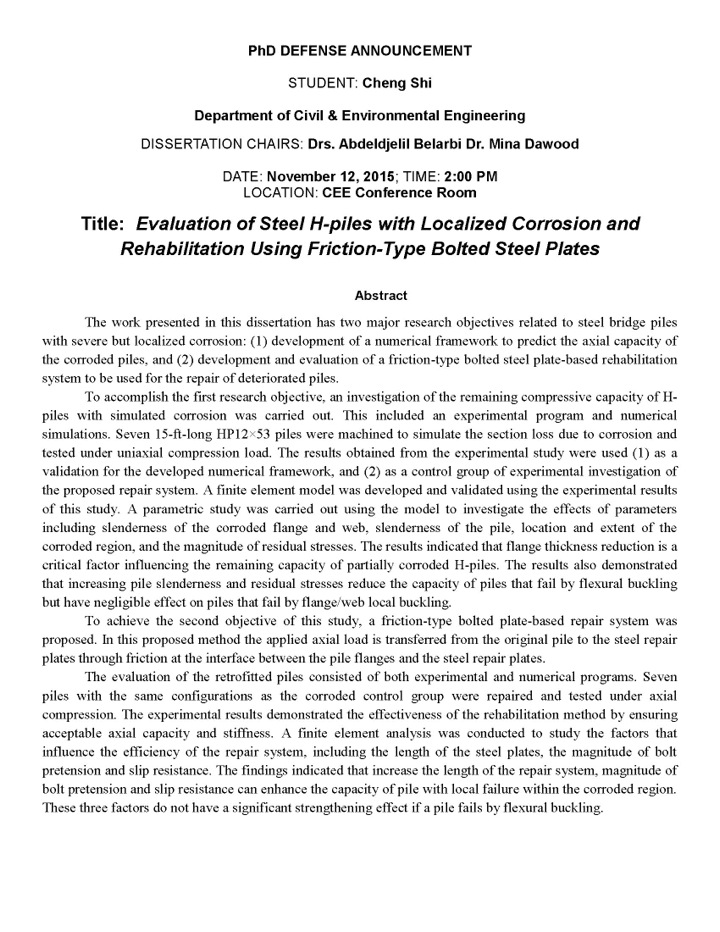[CCoE Notice] Thesis Defense: Evaluation of Steel H-Piles with Localized Corrosion and Rehabilitation Using Friction-Type Bolted Steel Plates