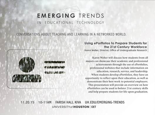 Karen Weber will discuss how students from all majors can showcase their academic and professional achievements through the use of ePortfolios, professional websites that include information on education, research, service, and leadership. When students develop ePortfolios, they have an opportunity to reflect upon their education, as well as demonstrate their best work to potential employers. This presentation will provide an overview on how ePortfolios can be used to bolster 21st century skills and help prepare students for life upon graduation.