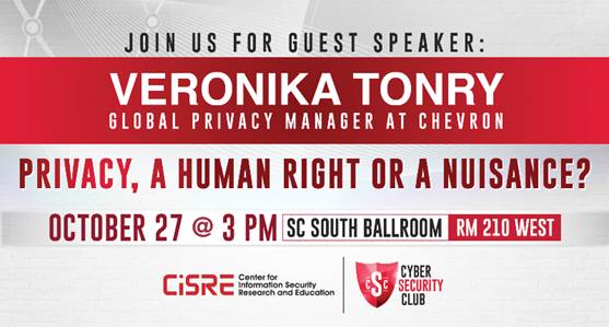 Please join us for a special guest speaker; Veronika Tonry, Global Privacy Manager at Chevron, for a discussion on "Privacy, A Human Right or a Nuisance?" Sponsored by The Center for Information Security Research and Education (CiSRE) and the Cyber Security Club on October 27th at 3p.m. in the Student Center South Ballroom, Room 210 West. Open to all students, faculty and staff.