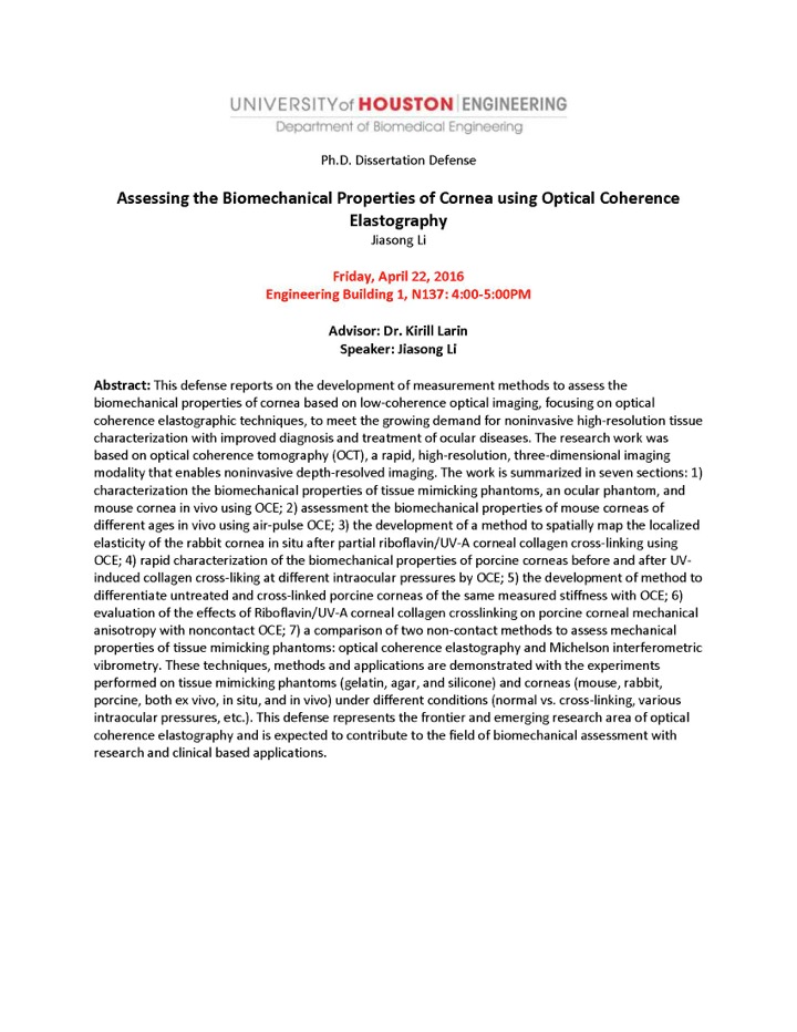 [CCoE Notice] Dissertation Defense: Assessing the Biomechanical Properties of Cornea using Optical Coherence Elastography