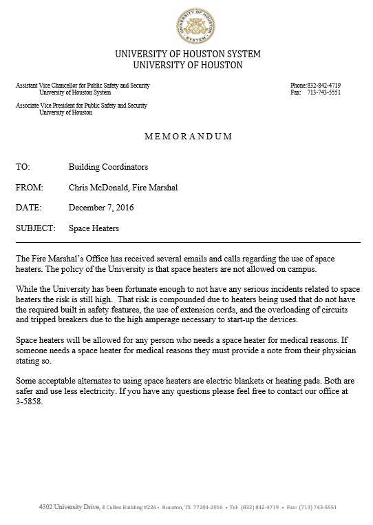 Please see the attached Space Heater Memo from the Fire Marshal. For your information.