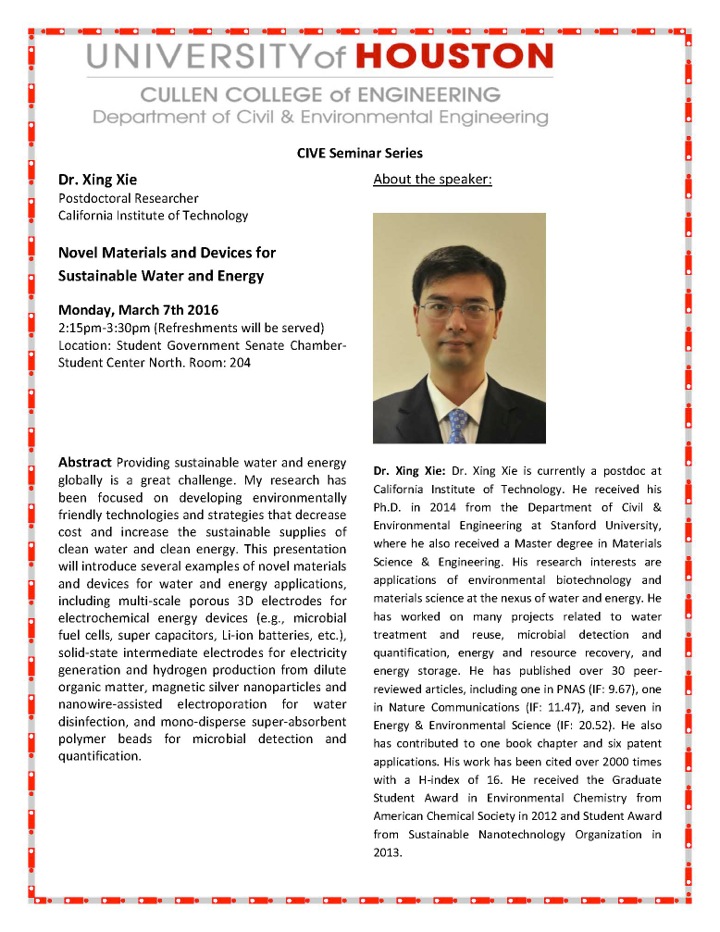 [CCoE Notice] CIVE Seminar: Novel Materials and Devices for Sustainable Water and Energy- Monday, March 7th