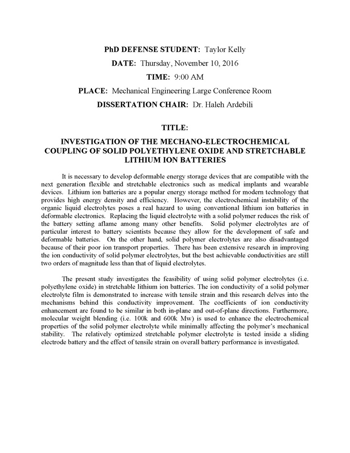 [CCoE Notice] Dissertation Announcement: Investigation of the Mechano-electrochemical Coupling of Solid Polyethylene Oxide and Stretchable Lithium Ion Batteries