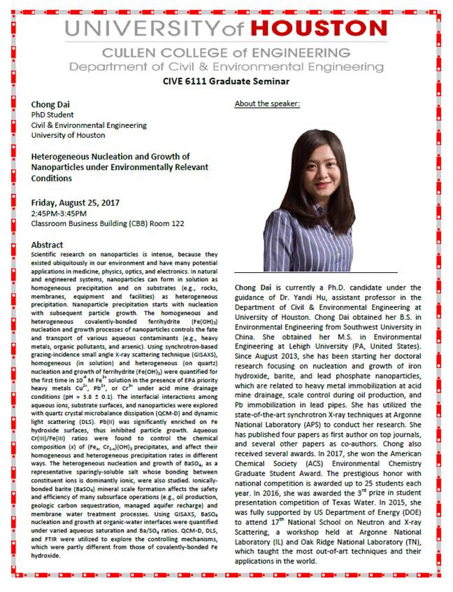 The CIVE 6111 Graduate Seminar is tomorrow, Friday, August 25th from 2:30PM-4:00PM (Light refreshments and set-up will be from 2:30-2:45PM. The talk will be held from 2:45PM-3:45PM) in the Classroom Business Building (CBB) Room 122. Graduate student Chong Dai will give a talk on Heterogeneous Nucleation and Growth of Nanoparticles under Environmentally Relevant Conditions.