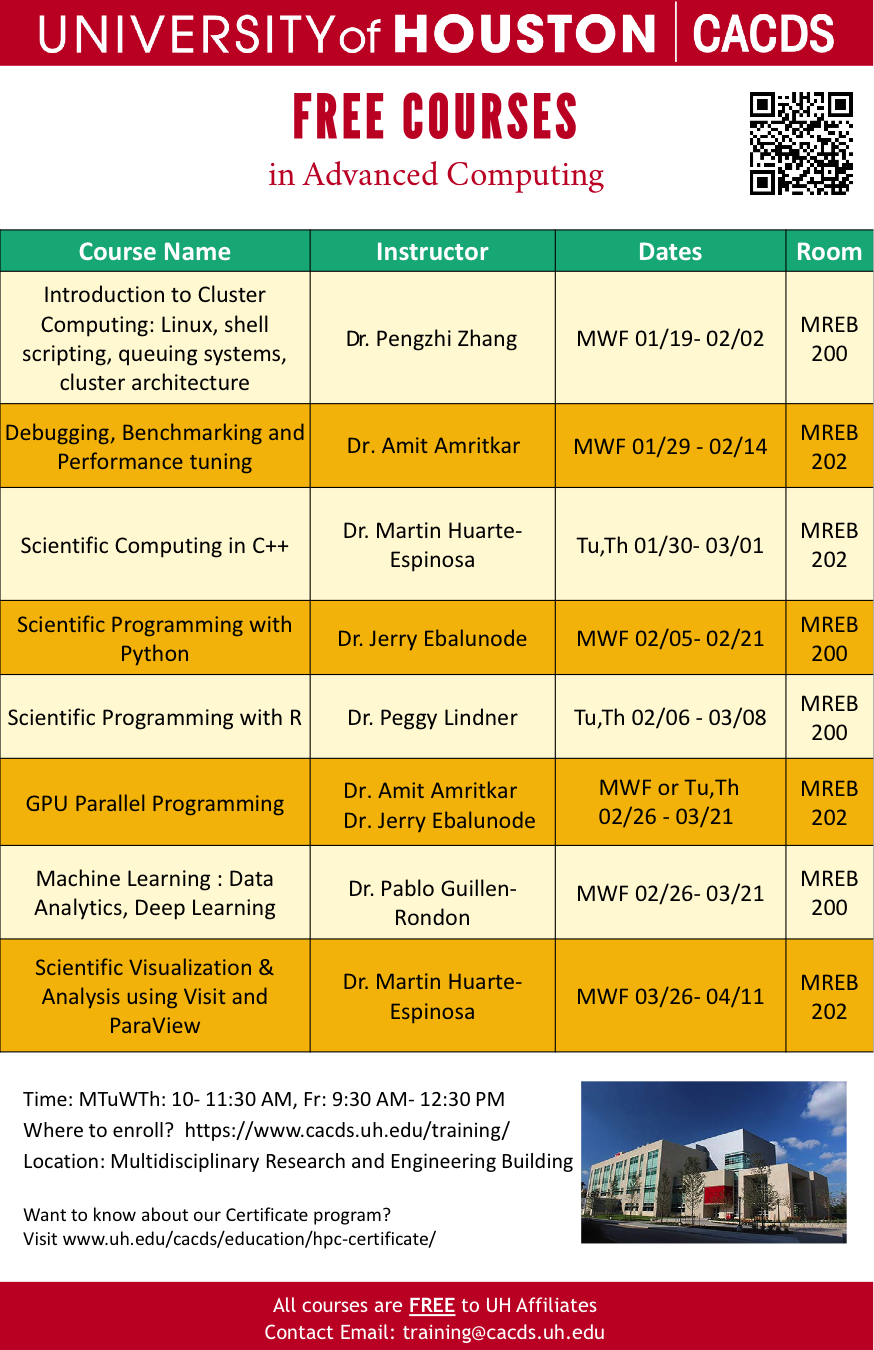 UH’s Center for Advanced Computing & Data Science offers free courses on advanced computing during the semester for all UH affiliates. Please see attached list of CACDS courses.