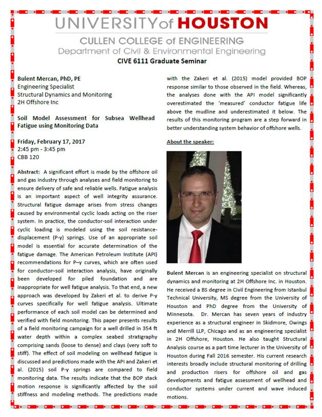 [CCoE Notice] Seminar Announcement: Soil Model Assessment for Subsea Wellhead Fatigue using Monitoring Data-Dr. Bulent Mercan-Friday, February 17th from 2:30PM-4:00PM-CBB Room 120