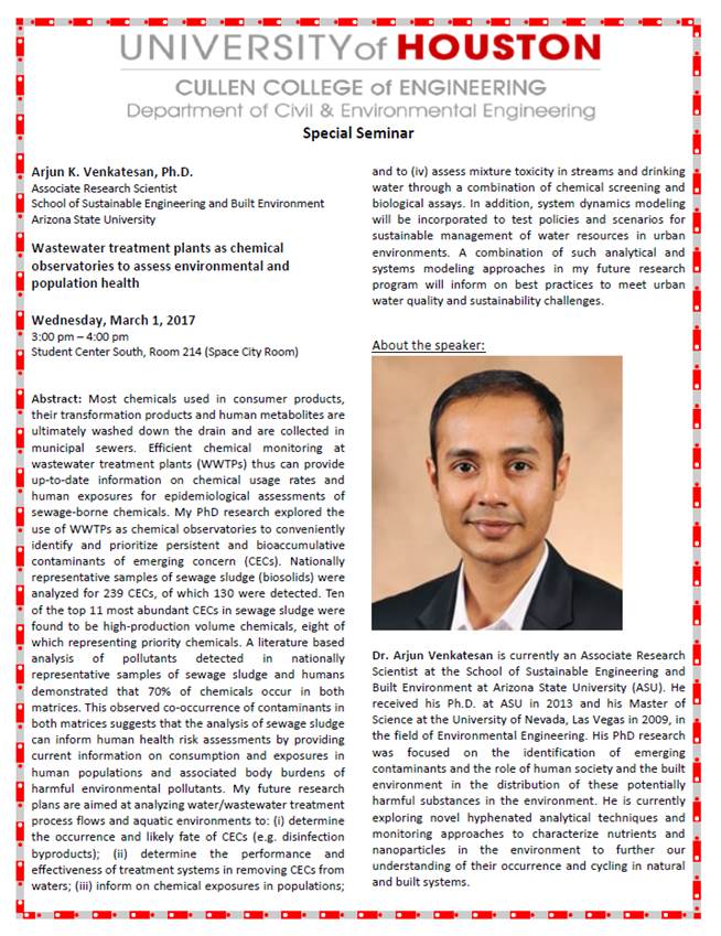 [CCoE Notice] CEE Seminar Announcement-Dr. Arjun K. Venkatesan- Wednesday, March 1st from 2:30-4:00PM in Room 214 (Space City Room) in the Student Center South