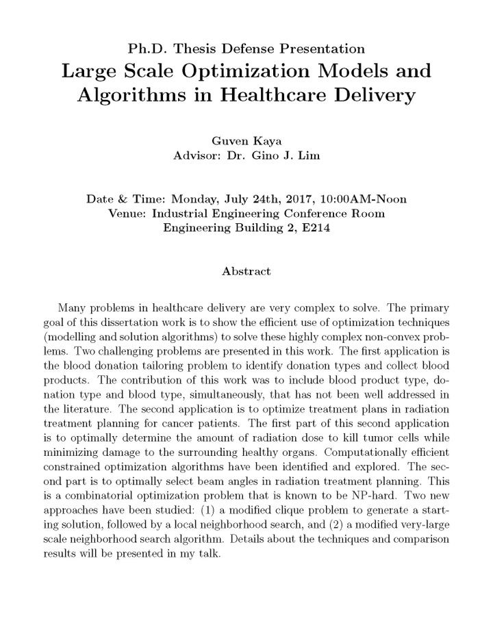 [CCoE Notice] PhD Dissertation: Large Scale Optimization Models and Algorithms in Healthcare Delivery