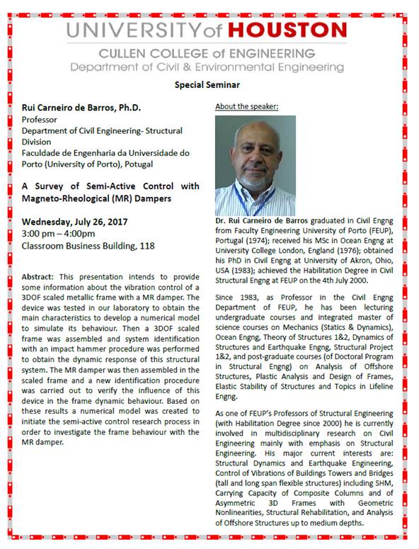 Dr. Rui Carneiro de Barro will present a seminar titled A Survey of Semi-Active Control with Magneto-Rheological (MR) Dampers on Wednesday, July 26 from 3:00PM-4:00PM in CBB 118.