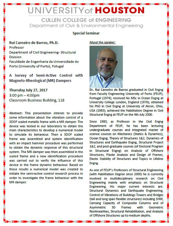 Please join us for Dr. Rui Carneiro de Barro's seminar titled A Survey of Semi-Active Control with Magneto-Rheological (MR) Dampers on Thursday, July 27th from 3:00PM-4:00PM in CBB 118.