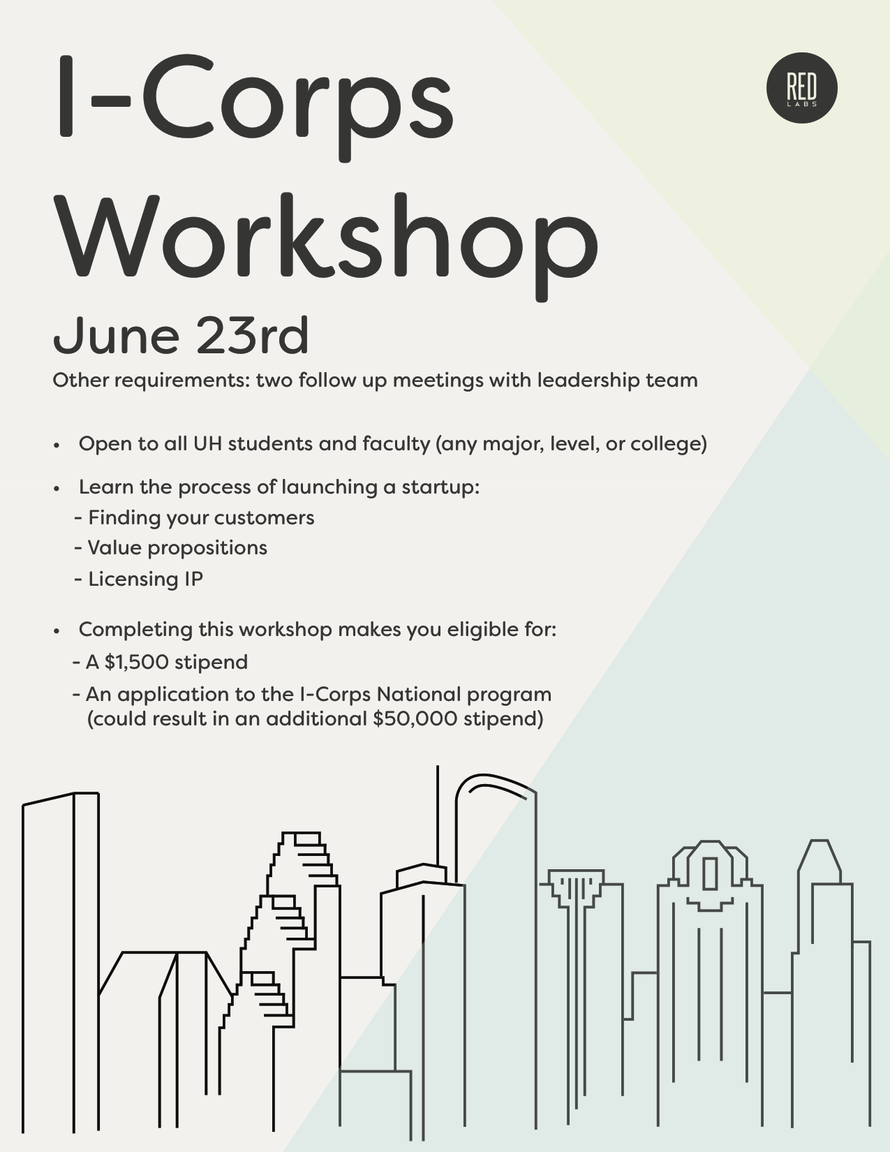 The summer I-Corps Workshop application is now open to all UH students and faculty from any major, level, or college. You simply need a tech startup idea. Participants will learn about the process of launching a startup including: how to find the right customer, bringing value to your customer, and how to handle intellectual property. The workshop will take place on Friday, June 23rd. Participants are expected to be in attendance all day (8:30am - 3:30pm) on Friday, June 23rd. Participants are also expected to participate in two follow up meetings in the weeks following the workshops with the I-Corps leadership team. These will include one check-in and one report out that will be scheduled with the participants following the workshop.