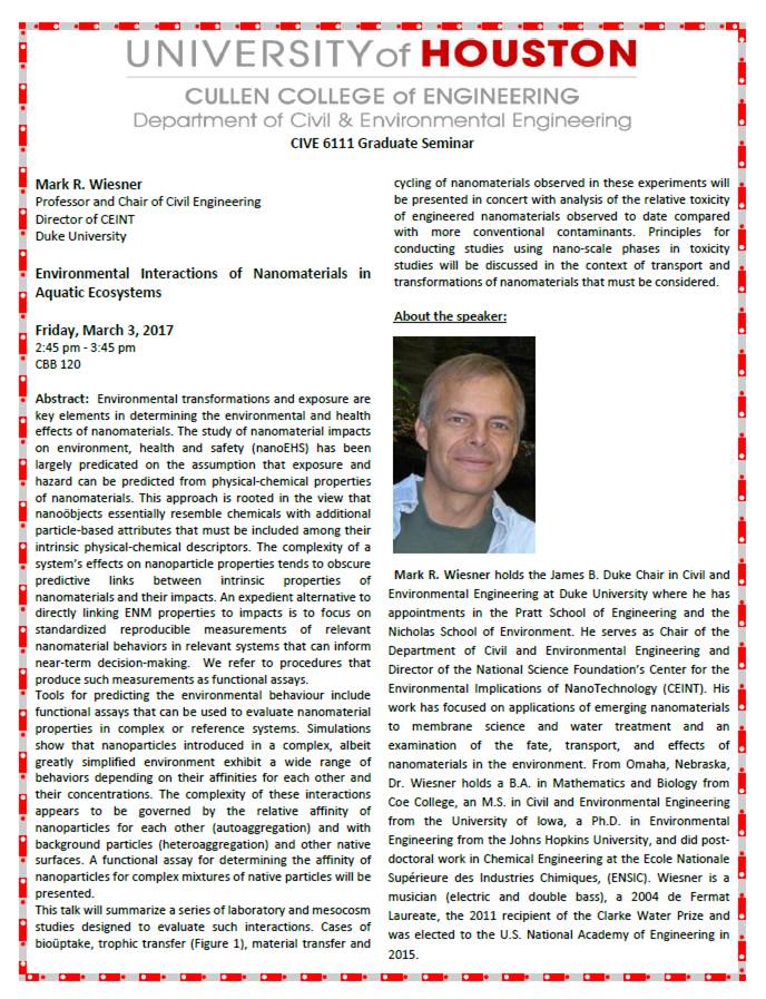 [CCoE Notice] CIVE Seminar: Environmental Interactions of Nanomaterials in Aquatic Ecosystems by Dr. Mark Wiesner on Friday (today), March 3rd from 2:30-4:00 PM in CBB 120